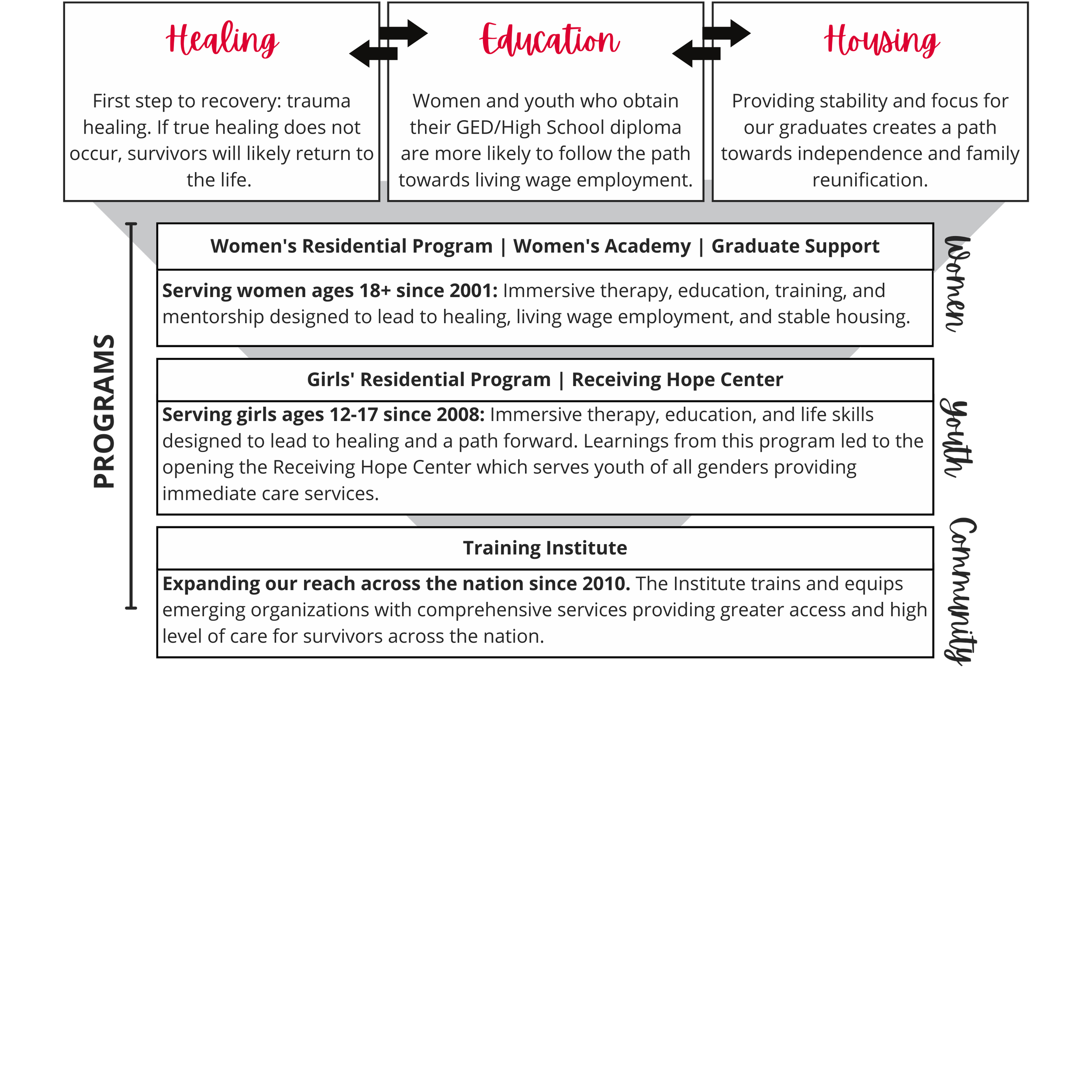 New: “We are an anti-human trafficking organization focused on the healing and restoring of survivors”.